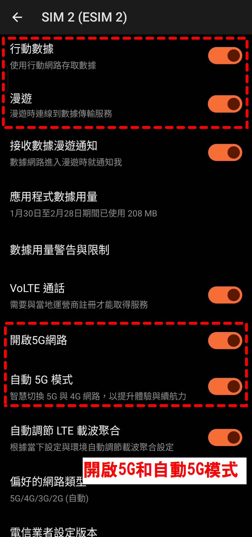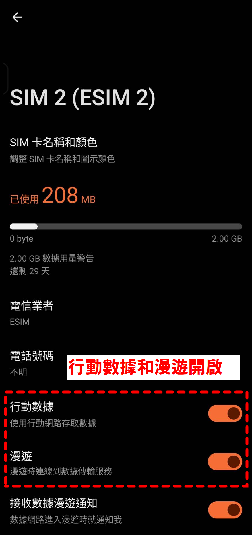 把「行動數據」切到「韓國旅遊網路 eSIM」,並開啟「數據漫遊/資料漫遊」。