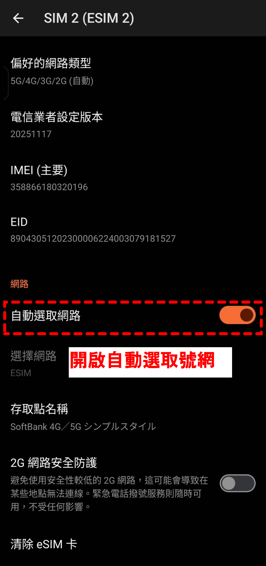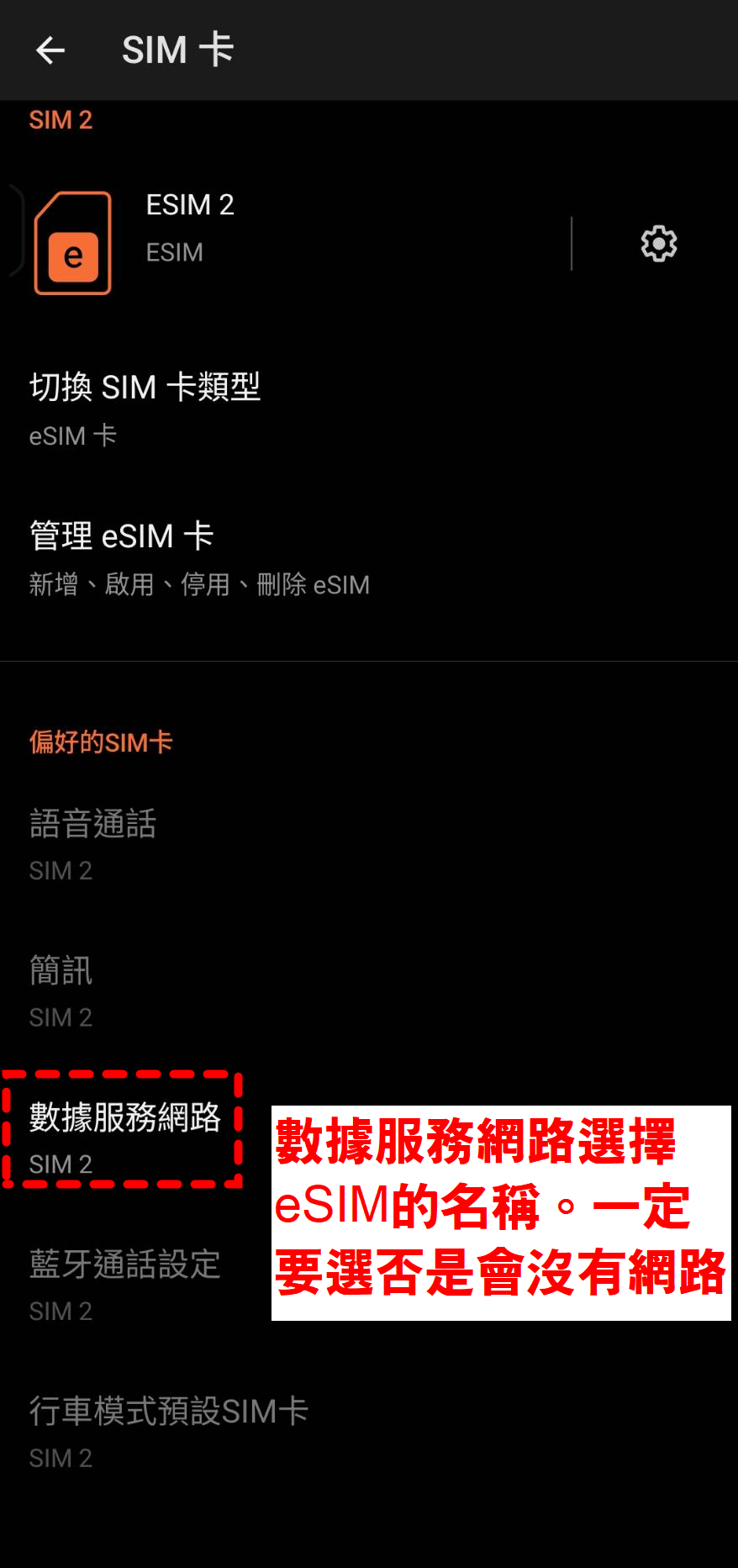 重開機 → 開關飛航 → 確認 eSIM 已啟用且「行動數據」使用 eSIM;必要時檢查 APN。