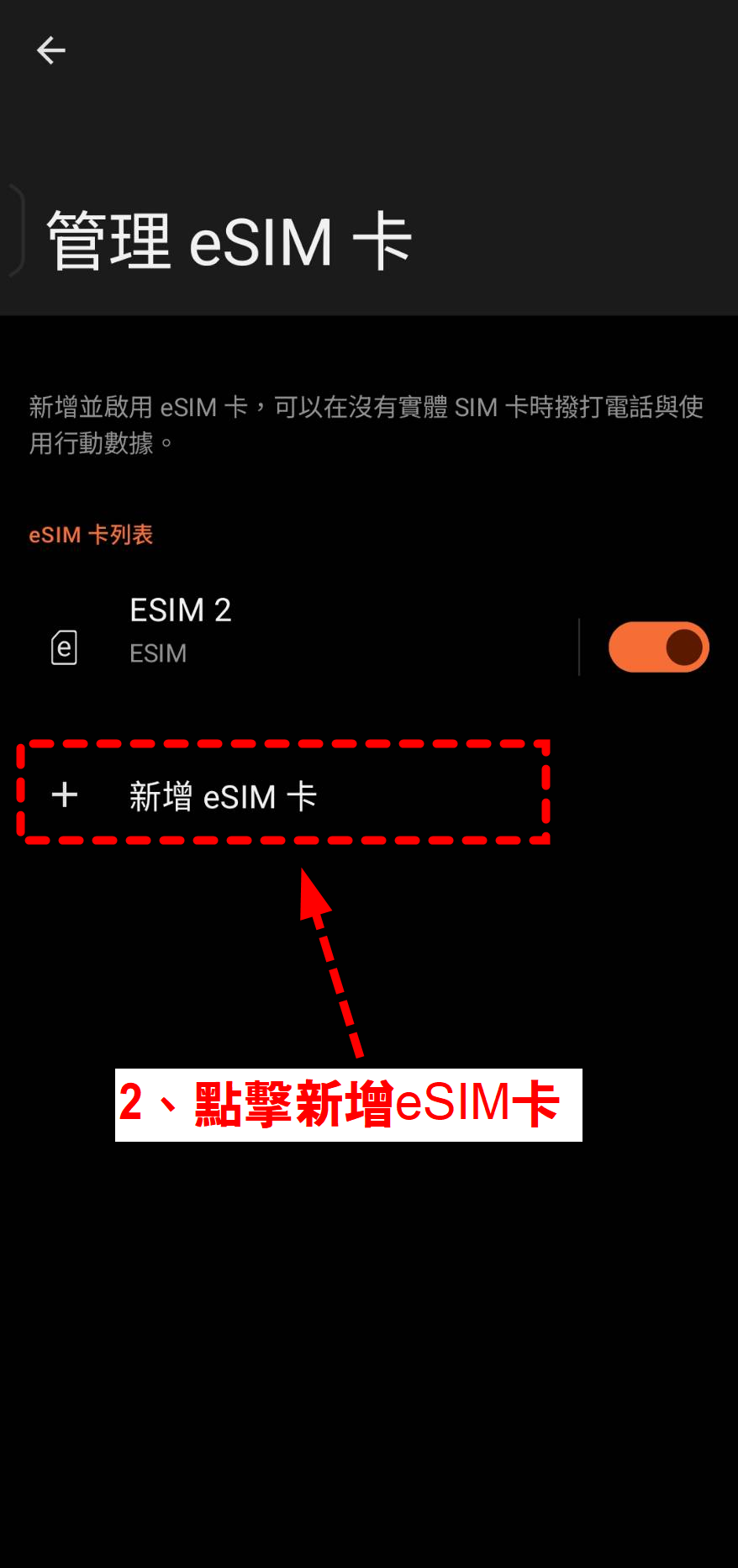 「設定」→「網路和網際網路/行動網路」→「SIM/電信卡」→「新增 eSIM/新增行動方案」→ 掃描 QR。