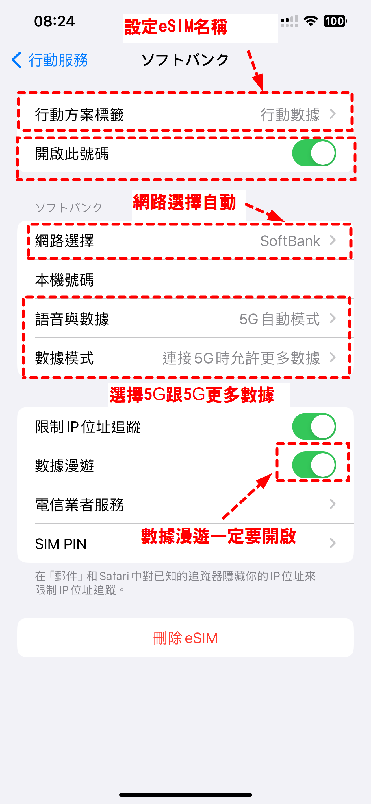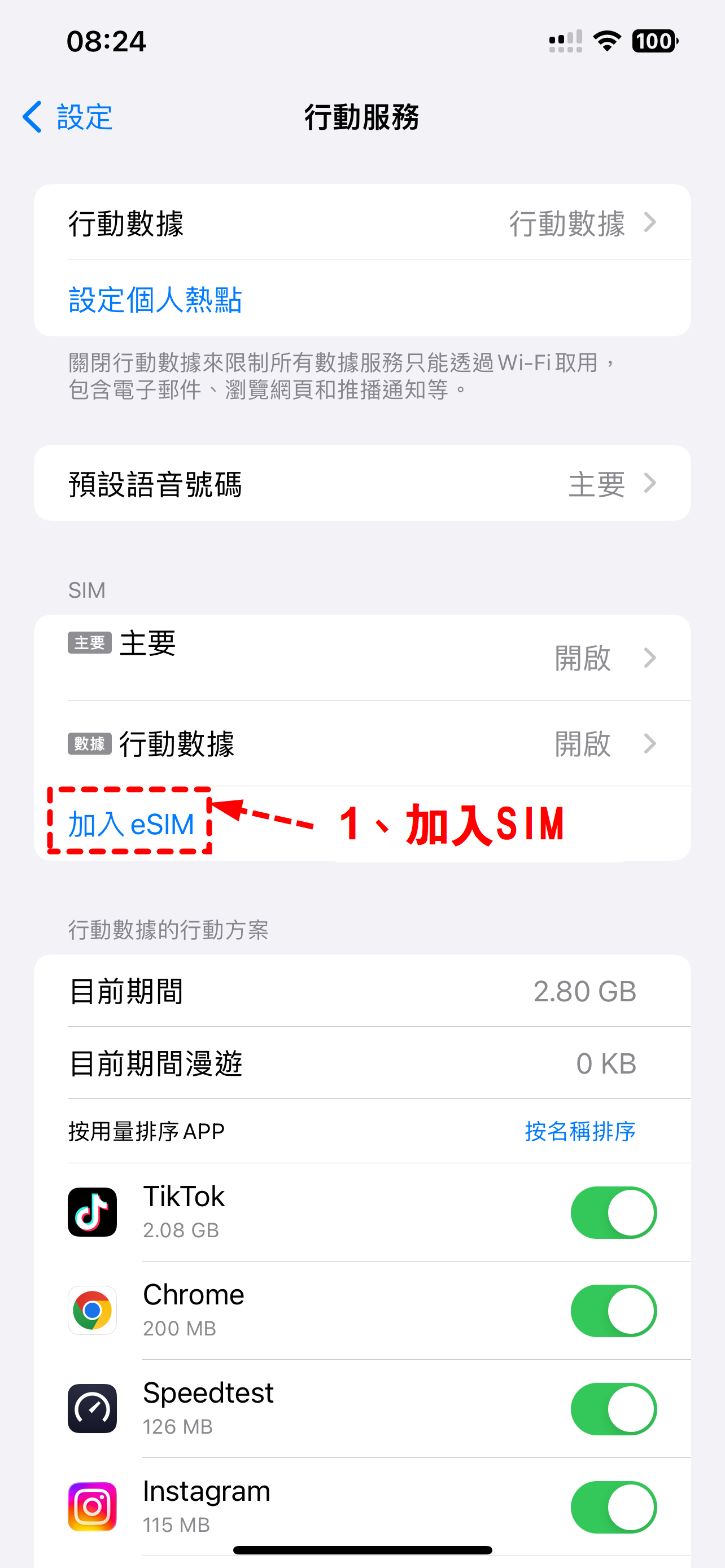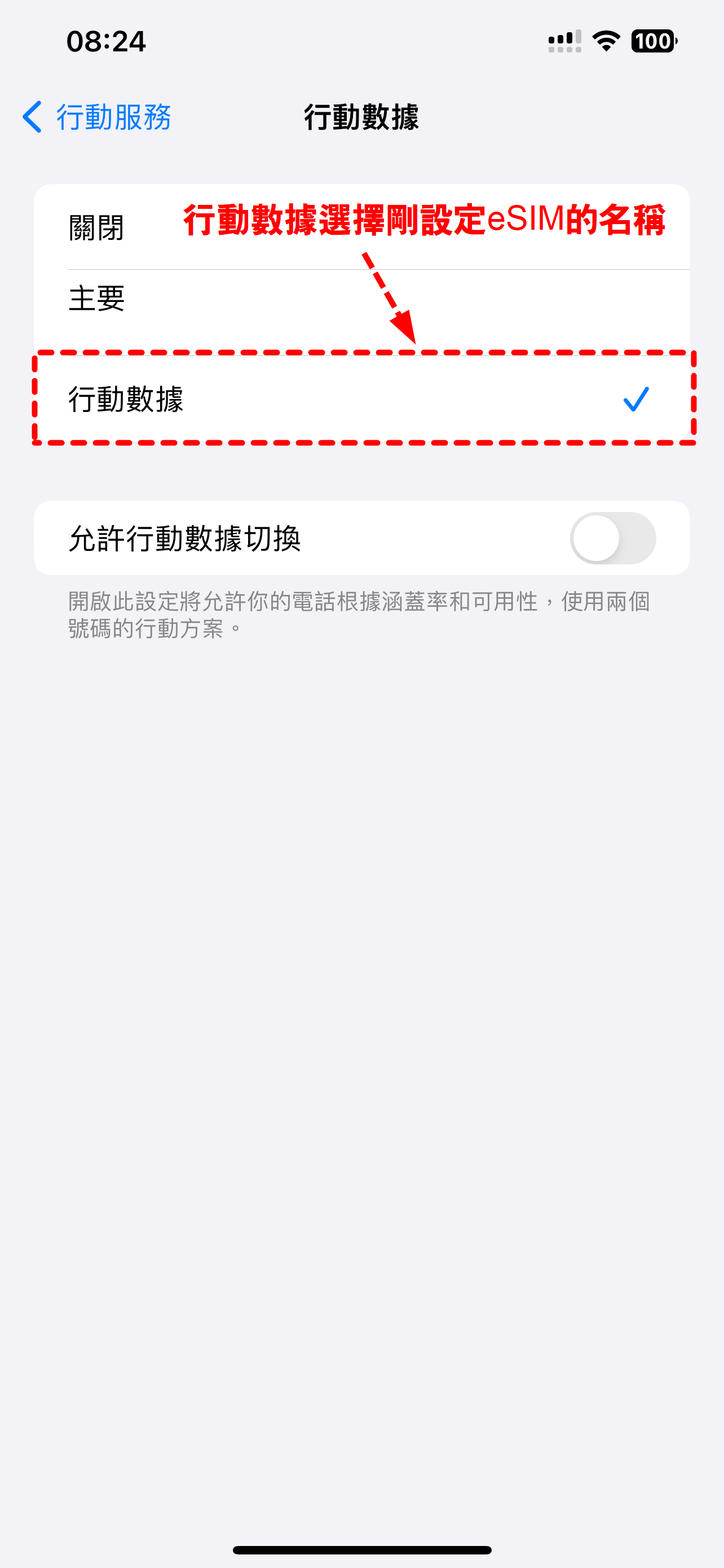 建議命名為「旅遊網路 eSIM」,並將「行動數據」切換到此 eSIM(語音/簡訊仍可維持原門號)。