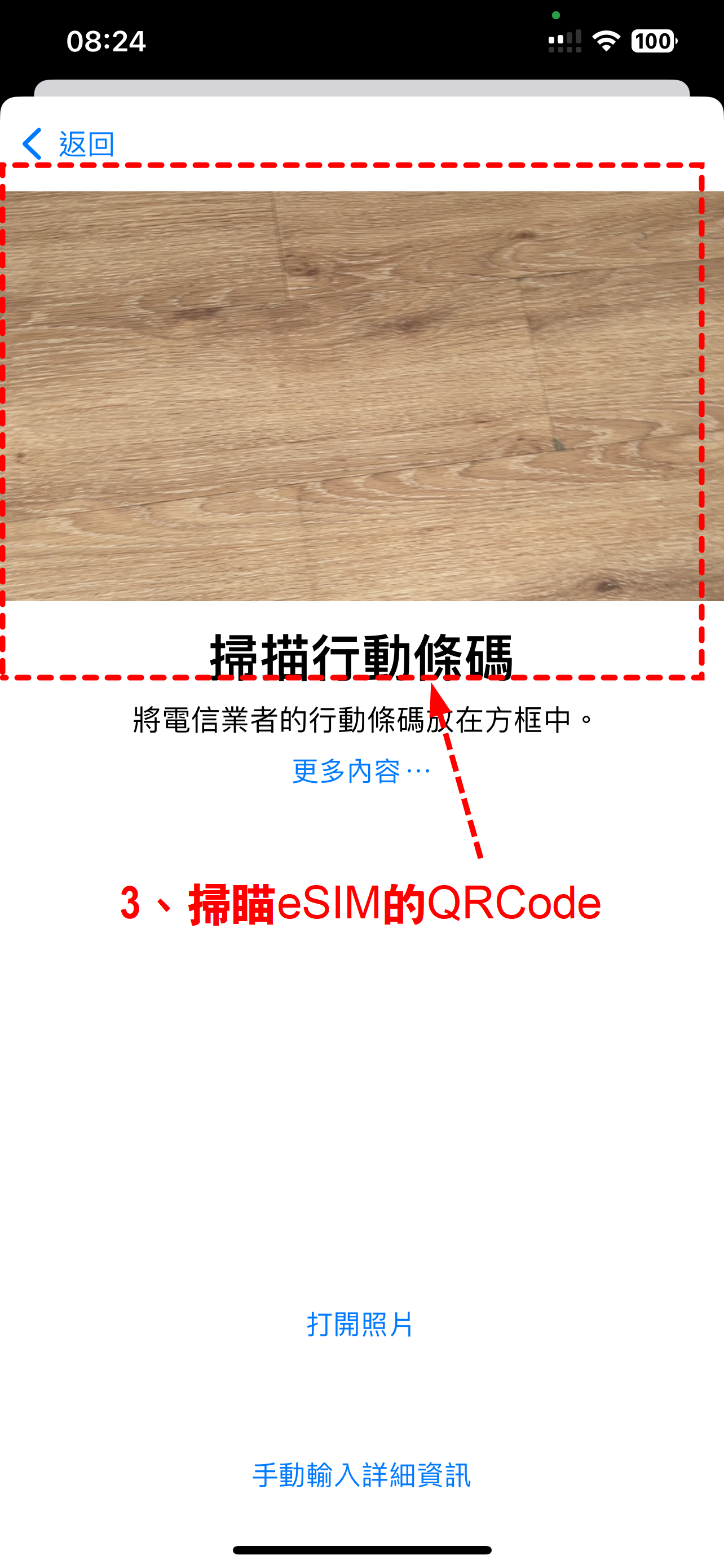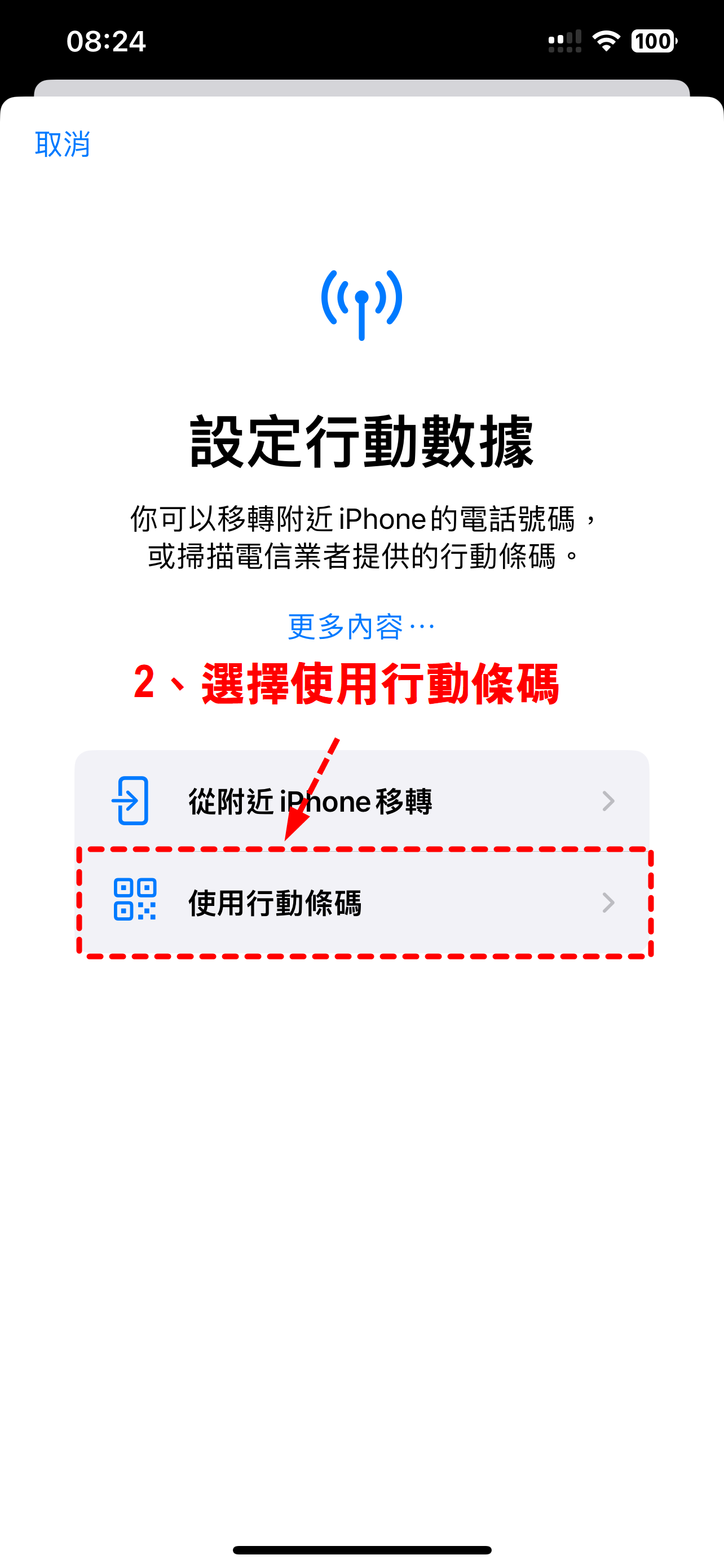 到「設定」→「行動服務/行動數據」→「加入 eSIM」→「使用 QR Code」→ 掃描。